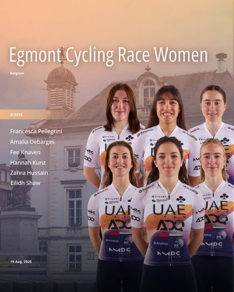 19/08/2025 Egmont Cycling Race Women (1.2) Zotteghem – Zotteghem (128.6 km) | BELGIUM Start: 13:00 – Finish: 16:30 CET LINE UP: Francesca Pellegrini, Hannah Kunz, Fee Knaven, Eilidh Shaw, Amalia Debarges, Zahra Hussain. Sports Director: Davide Gani. Maggiori info: https://www.egmontcyclingrace.be/en/en_startpage/