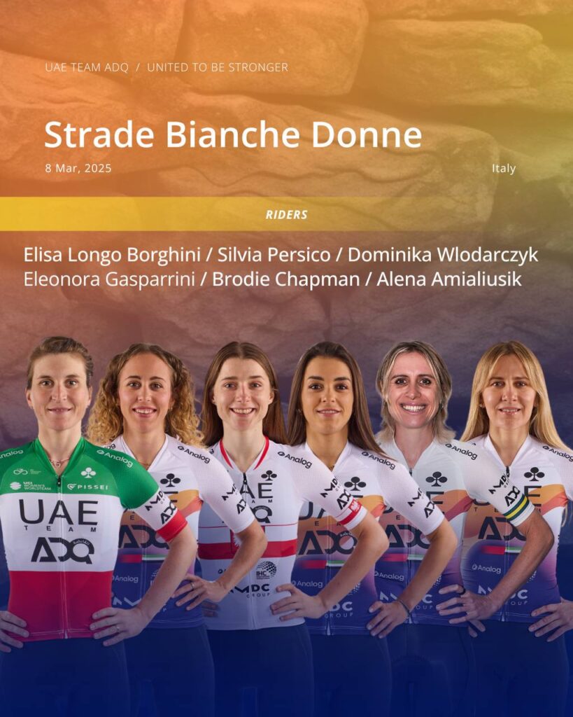 08/03/2025 Strade Bianche Donne (1.WWT) Siena-Siena (136km) | ITALY Start: 9:45 CET Finish 13:30 CET Live on discovery+ and Eurosport from 11:45 CET LINE UP: Elisa Longo Borghini, Silvia Persico, Brodie Chapman, Alena Amialiusik, Eleonora Gasparrini, Dominika Wlodarczyk. Sports Directors: Alejandro Gonzalez-Tablas and Nicolas Marche. More info: https://www.strade-bianche.it/en/percorso-donne/