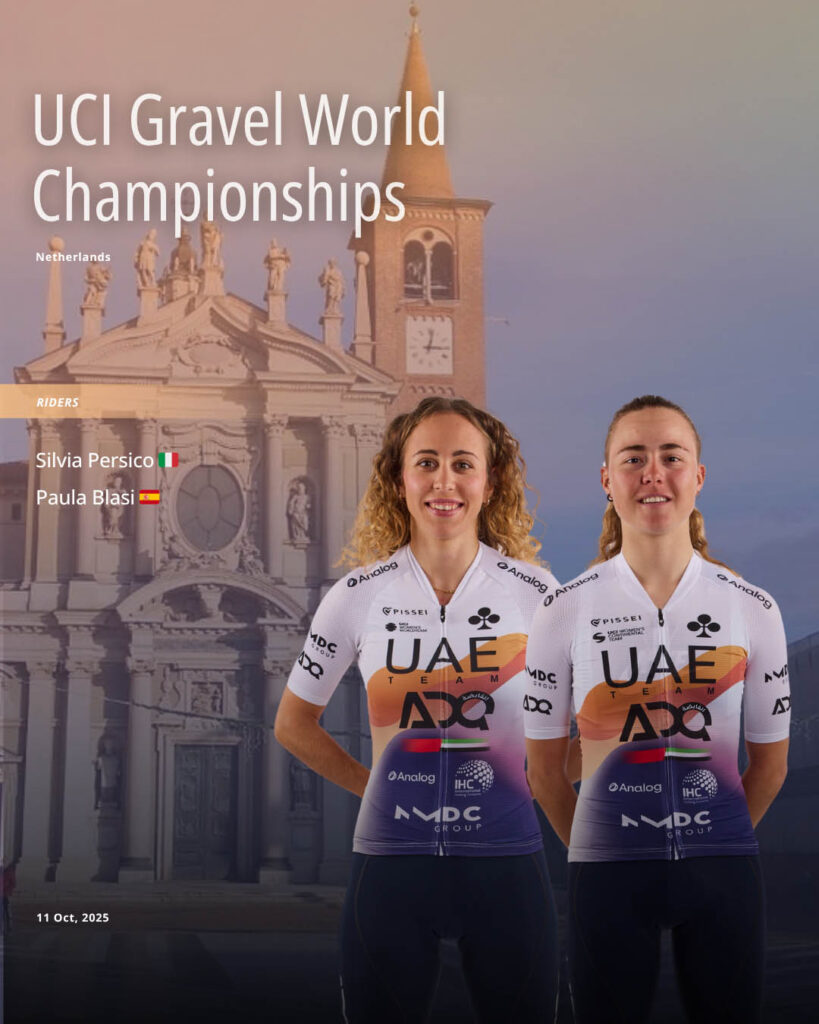 11/10/2025 UCI Gravel World Championships Zuid-Limburg – The Netherlands (131 km) Start: 11:00 – Finish: 14:30 CET LINE UP: Silvia Persico (Italy) Paula Blasi (Spain) More info: https://ucigravel2025.com/en/