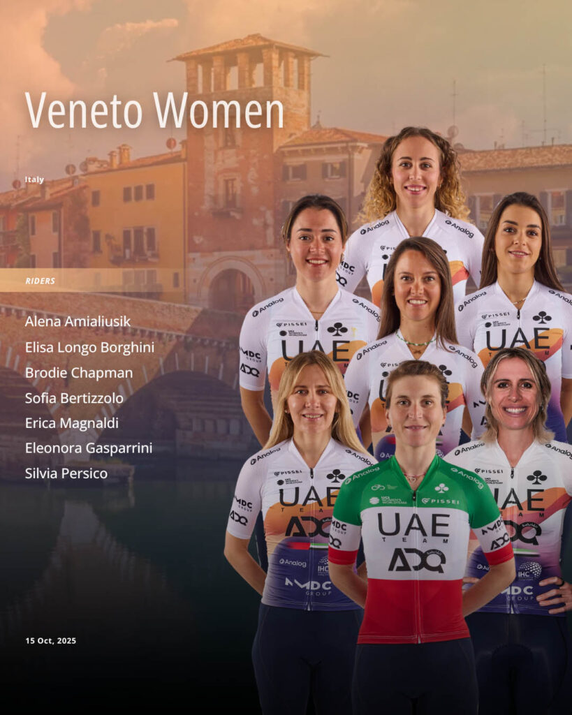 15/10/2025 Veneto Women Vicenza – Verona (116.2 km) | ITALY Start: 9:30 – Finish: 12:30 CET LINE UP: Elisa Longo Borghini, Alena Amialiusik, Sofia Bertizzolo, Brodie Chapman, Eleonora Gasparrini, Erica Magnaldi, Silvia Persico. Sports Director: Davide Gani. More info: https://www.girodelveneto.com/?veneto-women