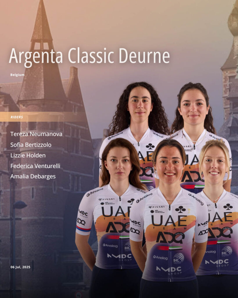 06/07/2025 Argenta Classic Deurne (1.1) Deurne – Deurne (132.9 km) | BELGIUM Start: 14:30 – Finish: 17:45 CET LINE UP: Sofia Bertizzolo, Tereza Neumanova, Lizzie Holden, Federica Venturelli, Amalia Debarges. Sports Director: Davide Gani. More info: https://www.argentaclassic.be/