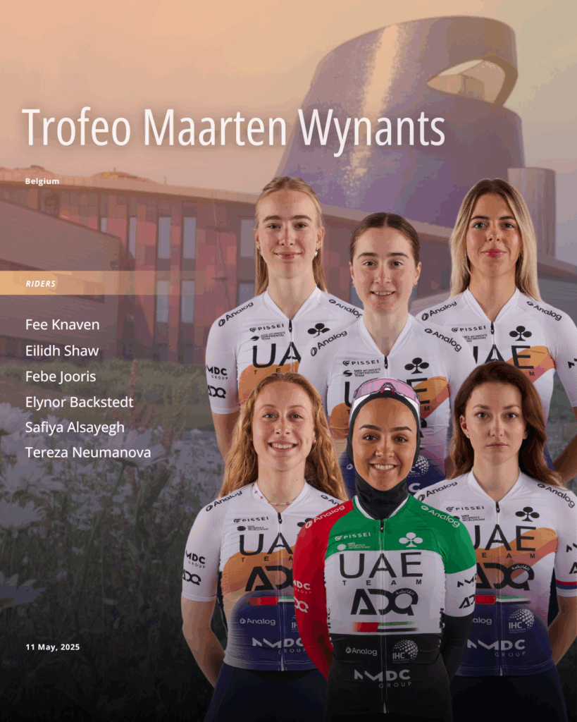 11/05/2025 Trofeo Maarten Wynants (1.1) Helchteren – Helchteren (116.6 km) Start: 11:00 CEST Finish: 14:30 CEST LINE UP: Tereza Neumanova, Elynor Backstedt, Safiya Al Sayegh, Fee Knaven, Eilidh Shaw, Febe Jooris. Sports Director: Davide Gani More info: https://trofeemaartenwynants.be/tmw/programma.html