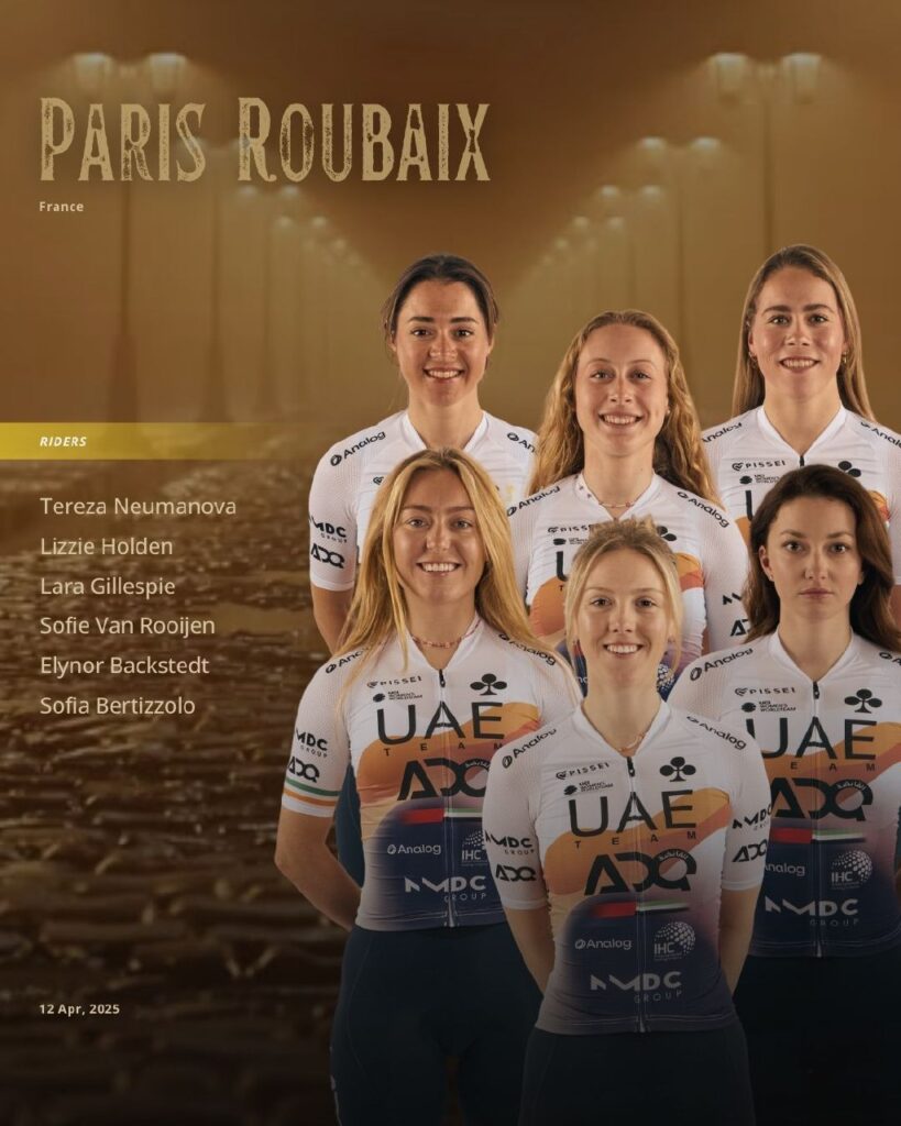 12/04/2025 Paris-Roubaix Femmes (1.WWT) Denain – Roubaix (148.5 km) | FRANCE Start: 13:00 CEST Finish: 17:00 CEST Live on discovery+ and Eurosport from 14:30 CEST Line up: Elynor Backstedt, Sofia Bertizzolo, Lara Gillespie, Lizzie Holden, Tereza Neumanova, Sofie van Rooijen. Sports Directors: Alejandro Gonzalez-Tablas and Cristina San Emeterio. More info: https://www.paris-roubaix-femmes.fr/en