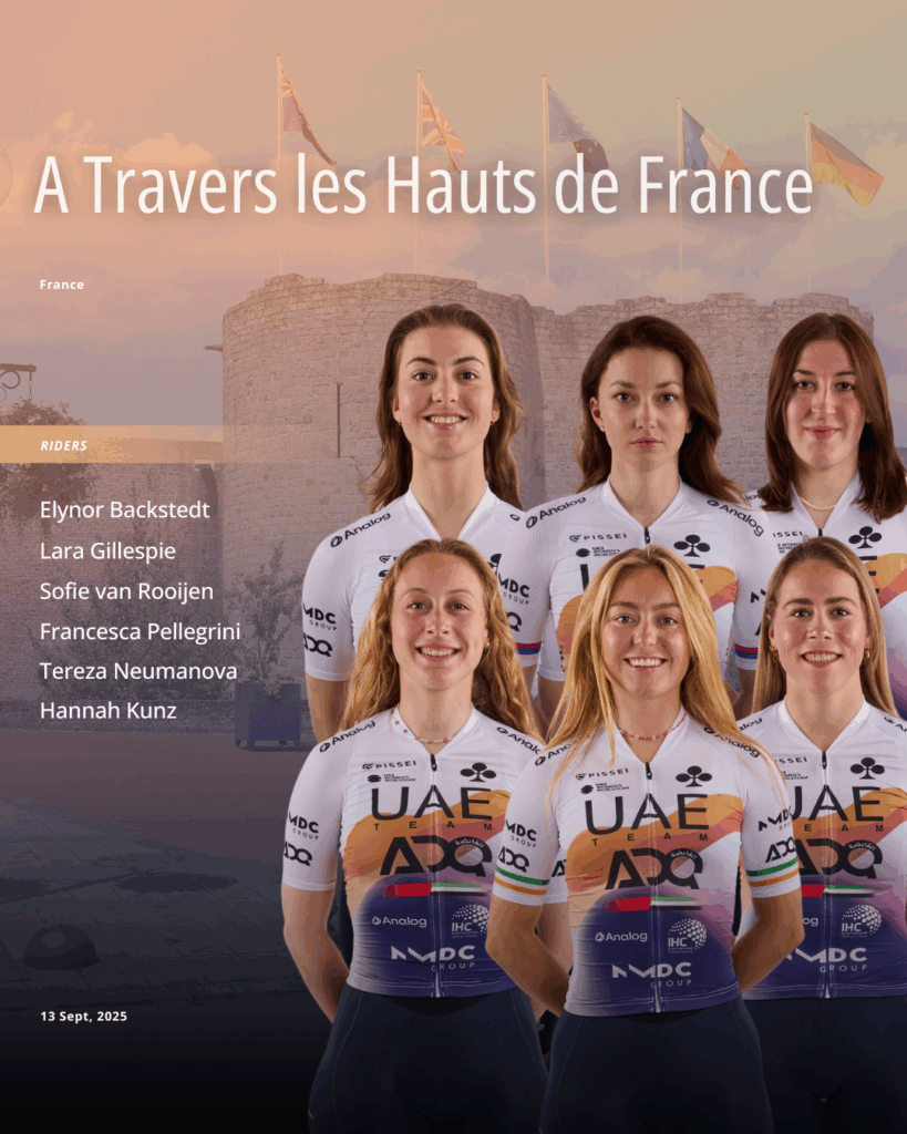 14/09/2025 La Choralis Fourmies Féminine (1.Pro) Fourmies – (123.1 km) | FRANCE Start: 11:50 – Finish: 15:00 CET LINE UP: Elynor Backstedt, Lara Gillespie, Hannah Kunz, Tereza Neumanova, Francesca Pellegrini, Sofie van Rooijen. Sports Director: Nicolas Marche More info: https://grandprixdefourmies.com/