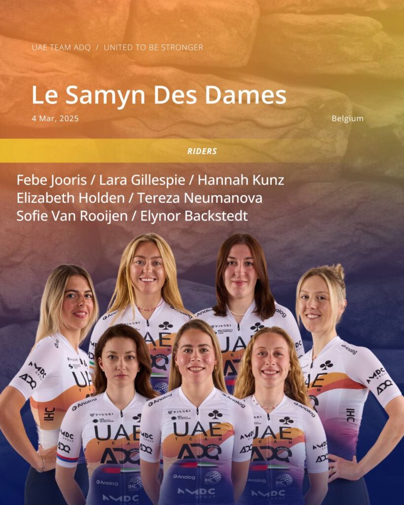 04/03/2025 Le Samyn des Dames (1.1) Start: Quaregnon 11:00 (CET) Finish: Dour 14:15 (CET) Distance: 122 km LIVE on discovery+ and Eurosport from 13:00 (CET) LINE UP: Lara Gillespie, Sofie Van Rooijen, Elynor Backstedt, Tereza Neumanova, Lizzie Holden, Febe Jooris, Hannah Kunz. Sports Directors: Cherie Pridham and Davide Gani. More info: https://ladies.lesamyn.be/