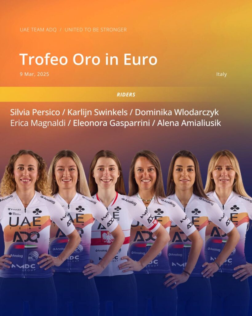 09/03/2025 Trofeo Oro in Euro (1.1) Cinquale di Montignoso – Cinquale di Montignoso (106.8 km) | ITALY Start: 13:30 CET Finish: 16:10 CET LINE UP: Silvia Persico, Erica Magnaldi, Alena Amialiusik, Karlijn Swinkels, Dominika Wlodarczyk, Eleonora Gasparrini. Sports Director: Nicolas Marche. More info: https://www.montignosociclismo.org/