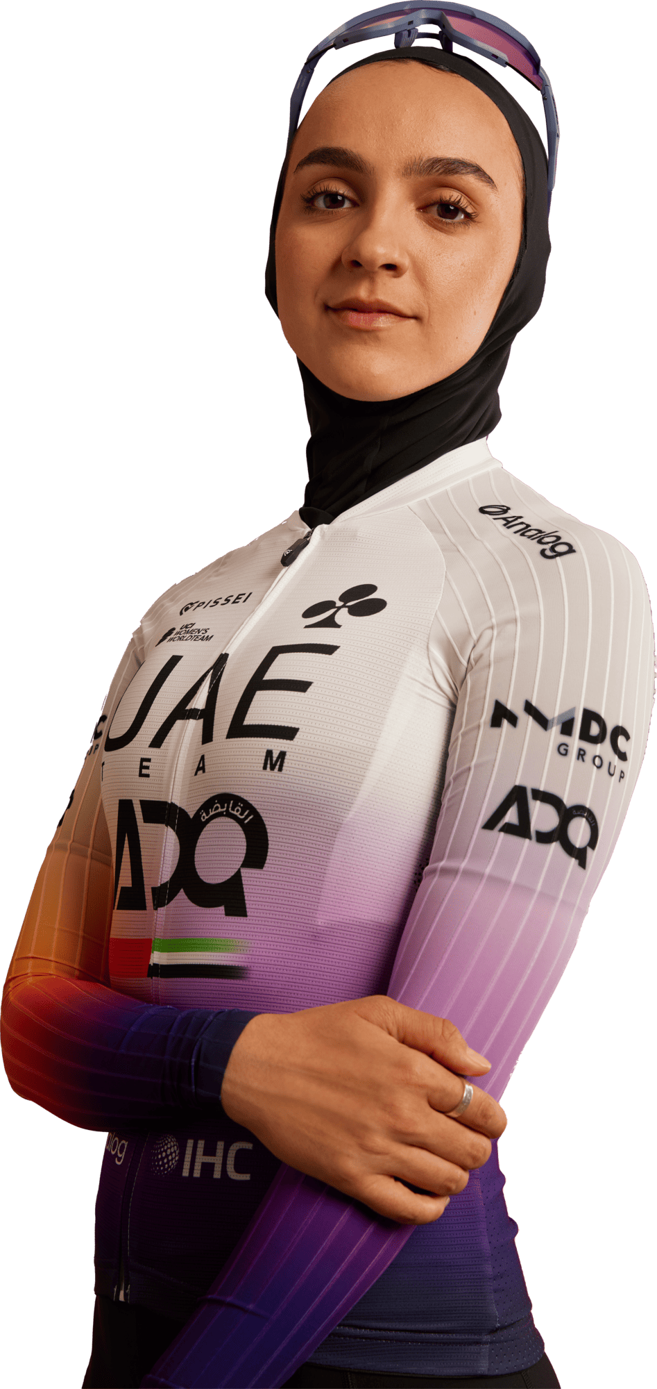 Safiya, a UAE national, proudly represents her birth country as the first Emirati woman on the UAE Team ADQ Women’s World Team. Safiya may humbly not recognise her own superpower, but she is an inspiration to many other women in the sporting fields, both in the UAE and worldwide. Safiya is supported by a strong family network, her father Is her biggest role model and provides the support and encouragement that Safiya needs to meet her demanding university schedule of graphic design studies, while juggling her vigorous training schedule. If Safiya could offer any advice it would be that setbacks can either be viewed as roadblocks in life, setting us apart from our dreams, or they can be viewed as opportunities to learn and grow and discover that there is always something better that awaits on the other side of your shortcomings. Nothing is impossible. For the fifth time in a row, Safiya Alsayegh secured her National title in Individual Time Trial and Road Race at the annual National Championship (2021-2025). Continuing to develop with high ambitions until the qualification for the Olympics in 2024 in Paris, a historic goal achieved, and so she will be the first female cyclist from the United Arab Emirates to participate in the Olympic Games. A great personal achievement and one that also validates the work of her team. Safiya became the first Arab female cyclist to participate in a race of the UCI Women’s World Tour, the world’s top category of women’s cycling.